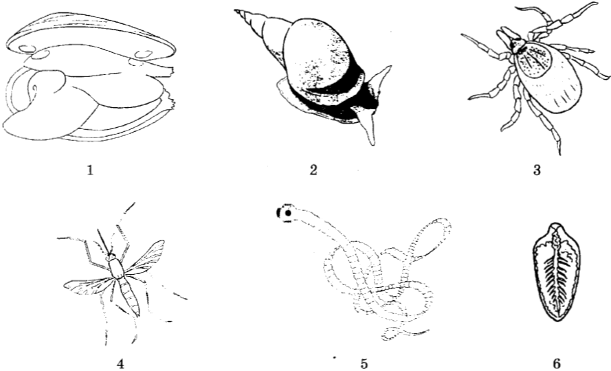 Какой цифрой на рисунках обозначено животное, личинки которого развиваются на теле рыбы?