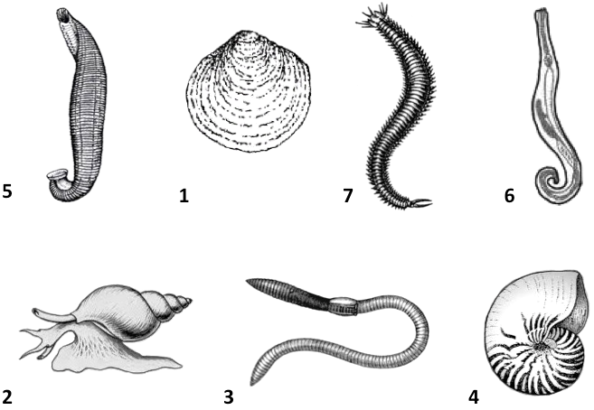 Какой цифрой на рисунке обозначен организм, относящийся к классу Головоногие моллюски?