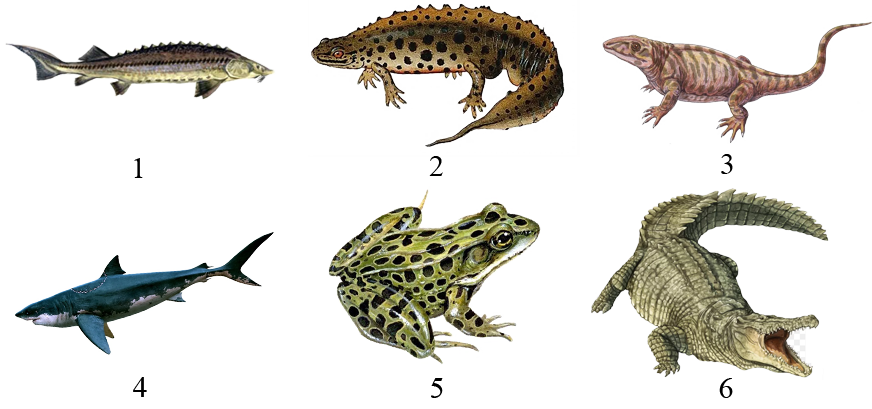 На рисунке под каким номером изображено позвоночное животное с четырехкамерным сердцем?