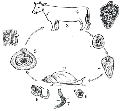Какой цифрой на рисунке обозначена ресничная личинка паразита?