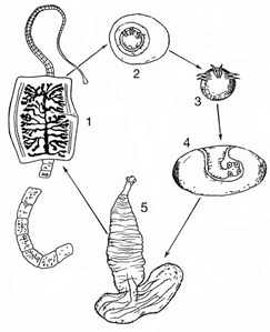 Какой цифрой на рисунке обозначена стадия жизненного цикла бычьего цепня, которая заражает промежуточного хозяина?
