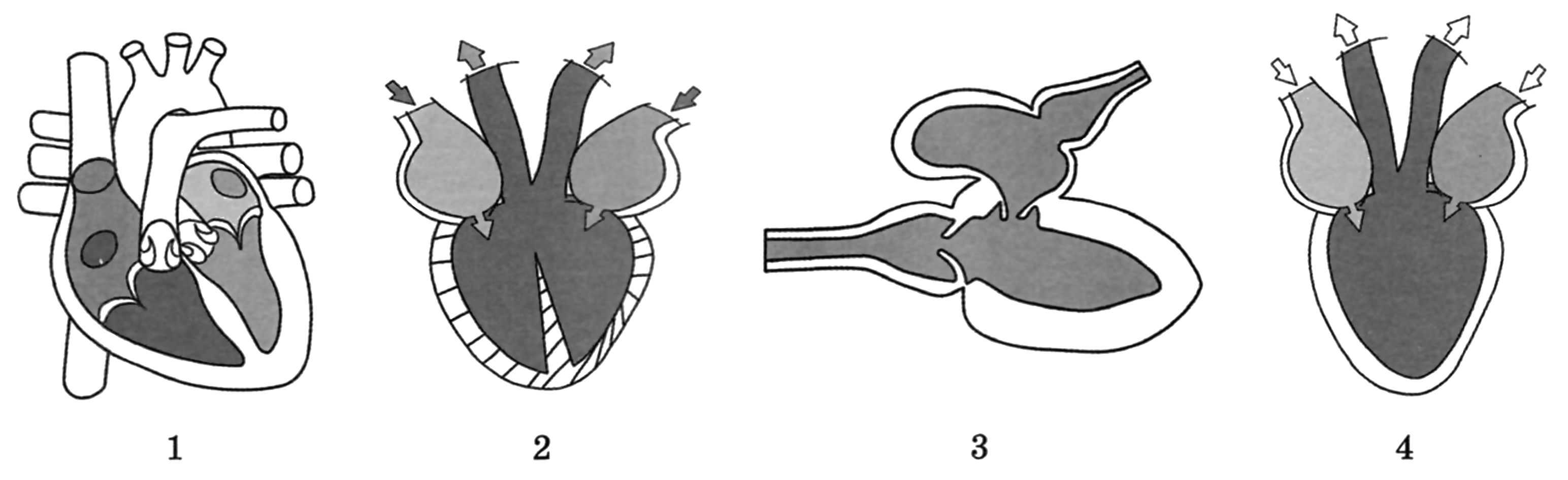 Какой цифрой на рисунке обозначено сердце животного, у которого впервые в ходе эволюции появился легочный круг кровообращения?