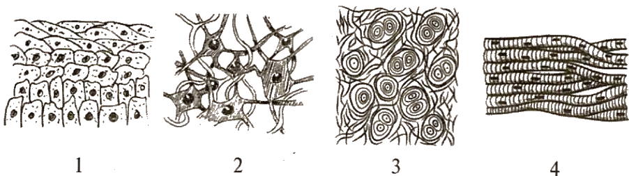 Установите соответствие между функциями и типами ткани, обозначенными на рисунках цифрами 1, 2, 3, 4. К каждой позиции, данной в первом столбце, подберите соответствующую позицию из второго столбца.