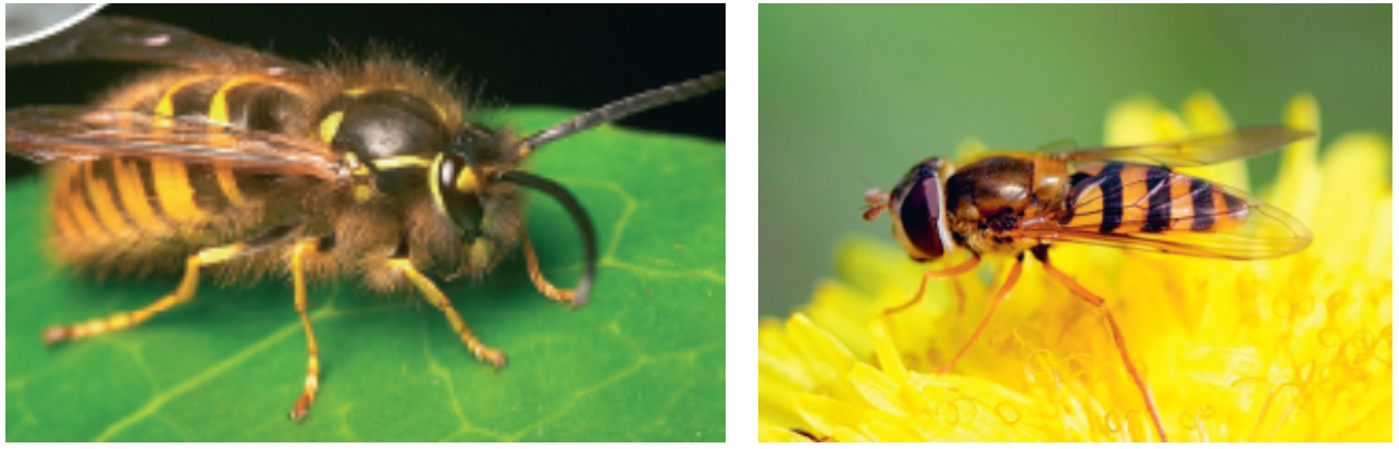 Рассмотрите рисунки с изображением осы и мухи-осовидки. Определите форму адаптации, тип внешнего проявления и направление эволюции, которые характерны для мухи-осовидки. Заполните пустые ячейки таблицы, используя элементы, приведенные в списке. Для каждой ячейки, обозначенной буквой, выберите соответствующий элемент из предложенного списка.