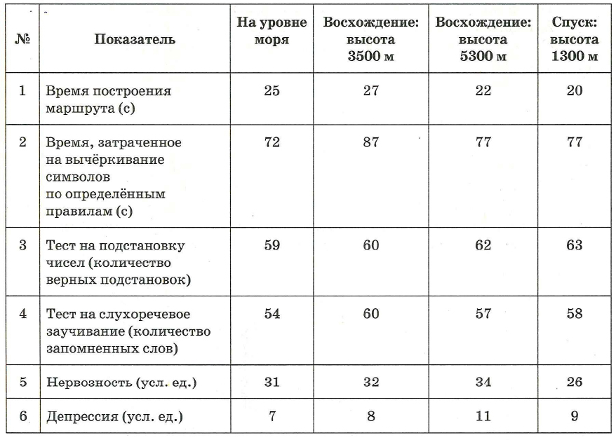 Проанализируйте таблицу «Показатели познавательных способностей и психологических характеристик у туристов при восхождении на Эверест и возвращении».