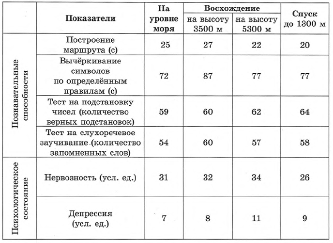 Проанализируйте таблицу «Показатели познавательных способностей и психологического состояния у туристов при восхождении на Эверест и спуске с горы».
