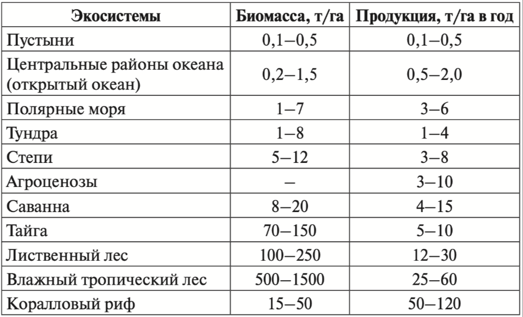 Проанализируйте таблицу «Биомасса и первичная продуктивность основных типов экосистем».