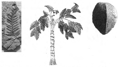 На рисунке изображены отпечатки листа, семени и реконструкция вымершего растения, обитавшего 350–285 млн лет назад.