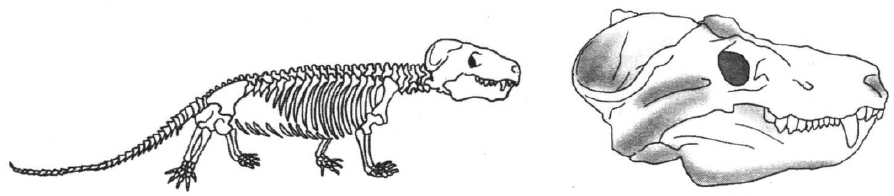 На рисунке изображены череп и реконструкция циногнатуса – вымершего животного появившегося 260 млн лет назад.