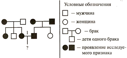 По изображенной на рисунке родословной определите вероятность рождения в браке, отмеченном цифрой 1, ребенка с признаком, обозначенным черным цветом, при полном доминировании этого признака. В ответе запишите только соответствующее число.