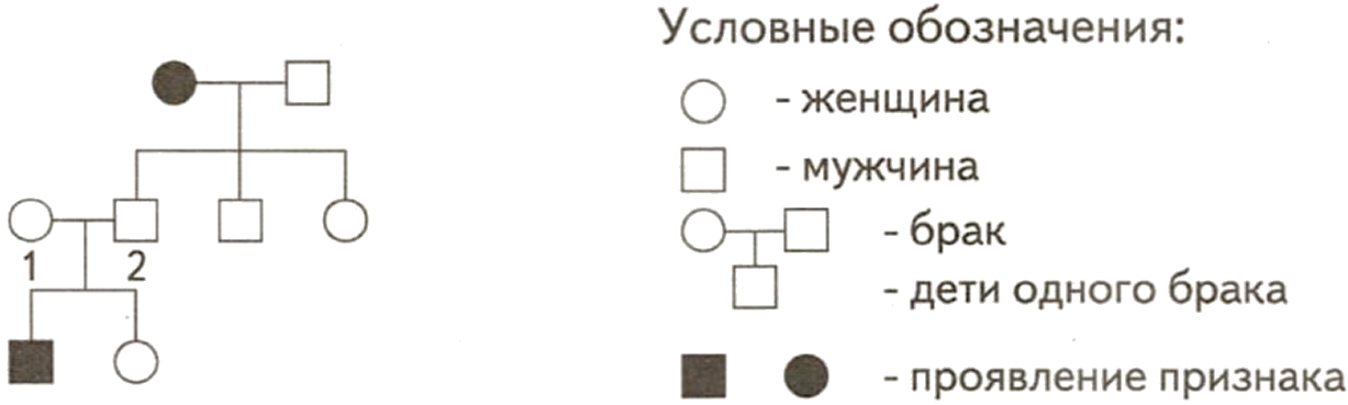 По изображенной на рисунке родословной определите вероятность (в %) рождения ребенка с признаком, обозначенным черным цветом у родителей 1 и 2. Взаимодействие аллелей — полное доминирование. В ответе запишите только соответствующее число.
