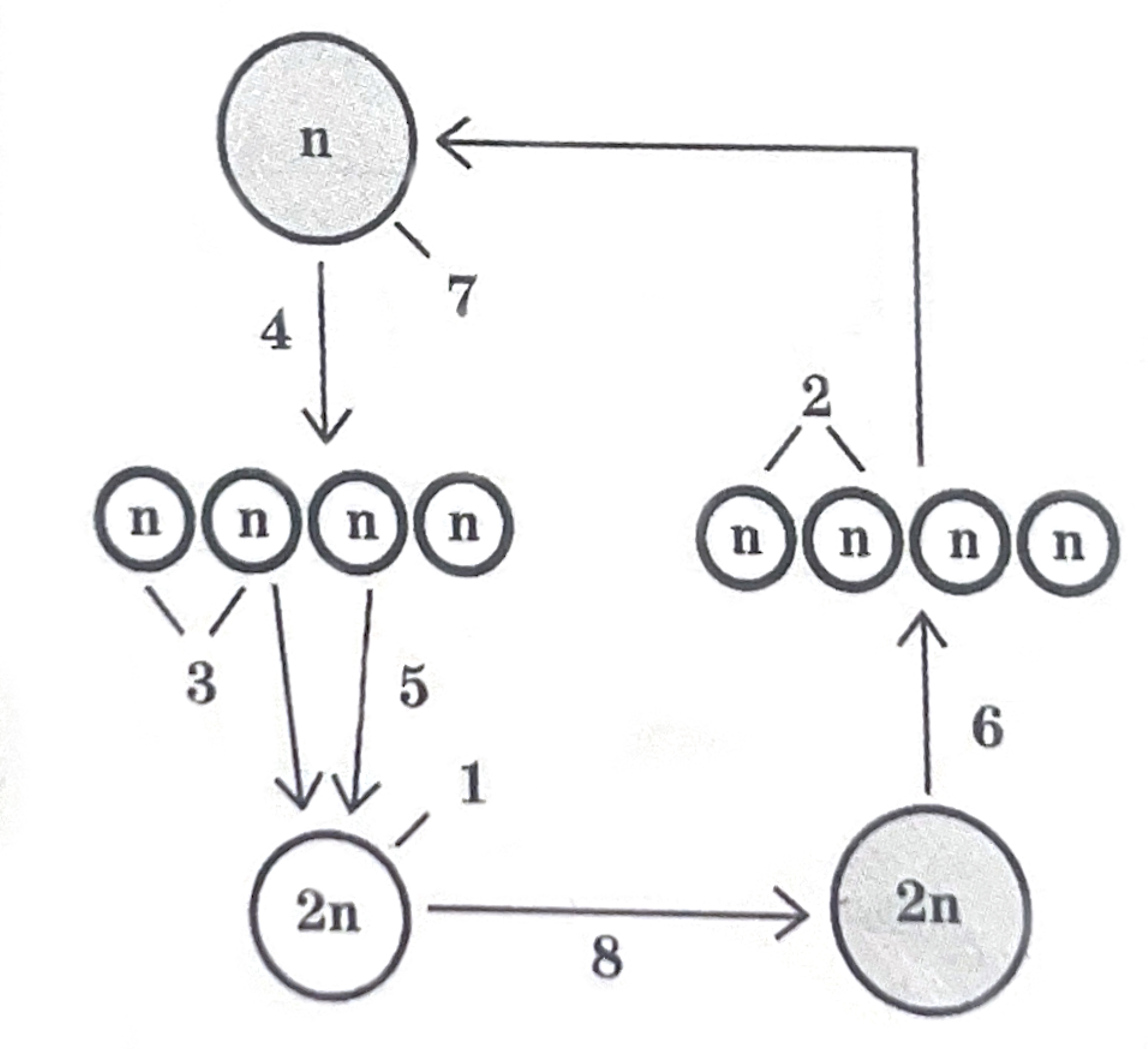 Каким номером на схеме обзначен порцесс образования многоклеточной диплоидной структуры?
