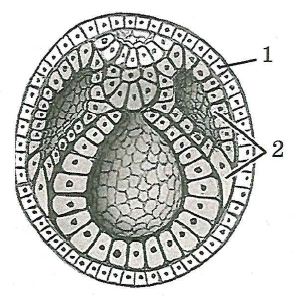 Установите соответствие между морфологическими образованиями организма и зародышевыми листками, обозначенными на рисунке цифрами 1, 2: к каждой позиции, данной в первом столбце, подберите соответствующую позицию из второго столбца.
