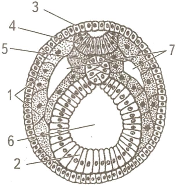 Установите соответствие между характеристиками и зародышевыми листками, обозначенными на рисунке цифрами 1, 2, 3: к каждой позиции, данной в первом столбце, подберите соответствующую позицию из второго столбца.
