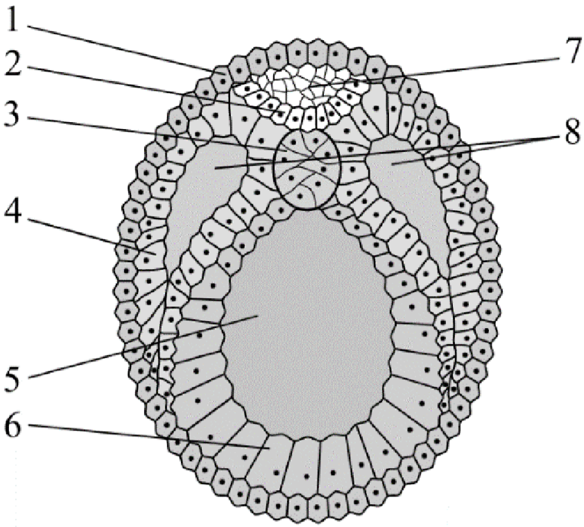 Установите соответствие между характеристиками и структурами эмбриона, обозначенными цифрами на рисунке: к каждой позиции, данной в первом столбце, подберите соответствующую позицию из второго столбца.