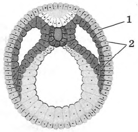 Установите соответствие между структурами и зародышевыми листками, обозначенными на рисунке цифрами 1, 2: к каждой позиции, данной в первом столбце, подберите соответствующую позицию из второго столбца.
