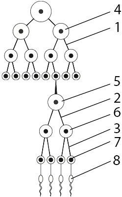 Установите соответствие между характеристиками и этапами сперматогенеза, обозначенными цифрами на рисунке: к каждой позиции, данной в первом столбце, подберите соответствующую позицию из второго столбца.