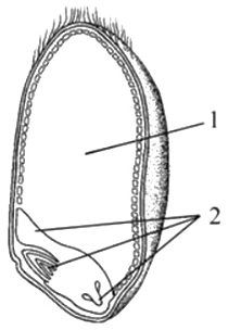 Установите соответствие между характеристиками и частями семени, обозначенными на рисунке цифрами 1, 2: к каждой позиции, данной в первом столбце, подберите соответствующую позицию из второго столбца.