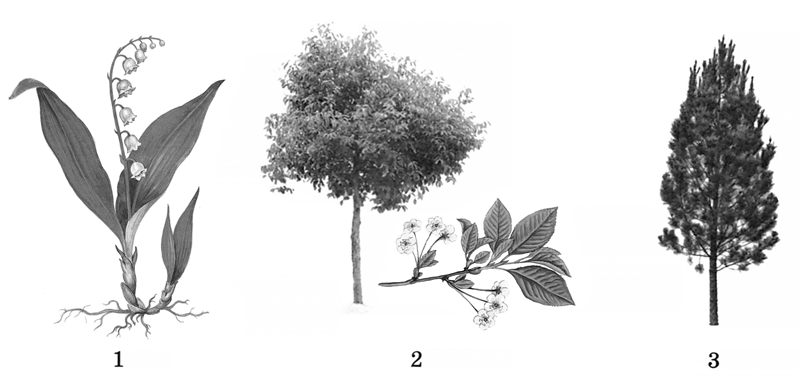 A) Сетчатое жилкование листа Б) Камбиальное кольцо в стебле B) Корневище Г) Главный корень Д) Трехчленный цветок Е) Зародыш имеет одну семядолю |