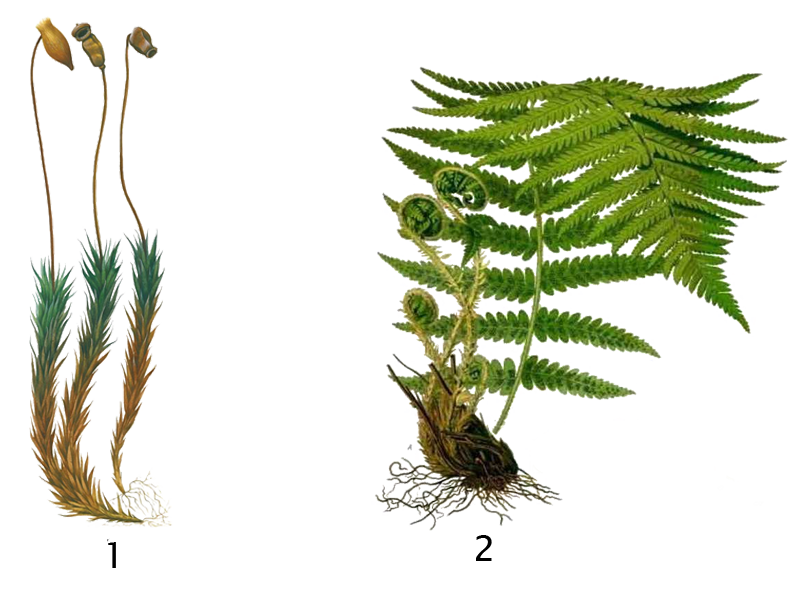 Установите соответствие между характеристиками и объектами, относящимися к разным отделам растений, обозначенными на рисунке цифрами 1, 2: к каждой позиции, данной в первом столбце, подберите соответствующую позицию из второго столбца.