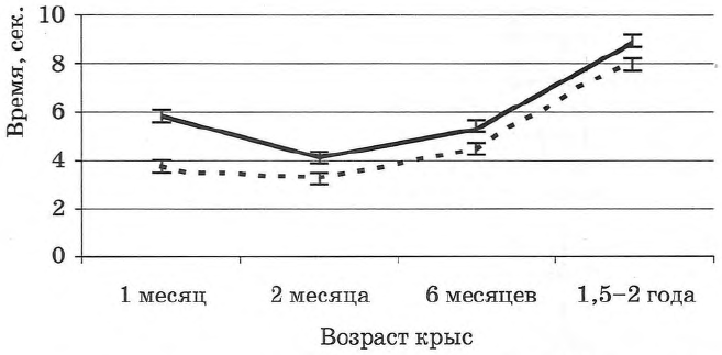 Проанализируйте график двигательной активности животных. Крысы разного возраста помещались в центр квадрата, замерялось время (в секундах), через которое они пересекали границу этого квадрата. Сплошной линией отмечена активность самцов, пунктирной – самок.