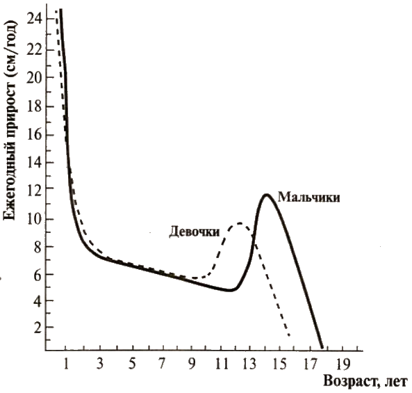 Проанализируйте график зависимости ежегодного прироста длины тела человека от возраста.