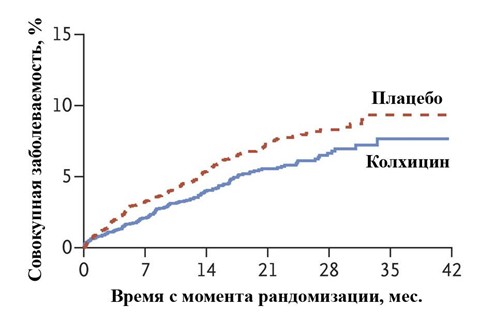 - Через 21 месяц после начала исследования в группе, получавшей колхицин, заболеваемость превышает 5%.