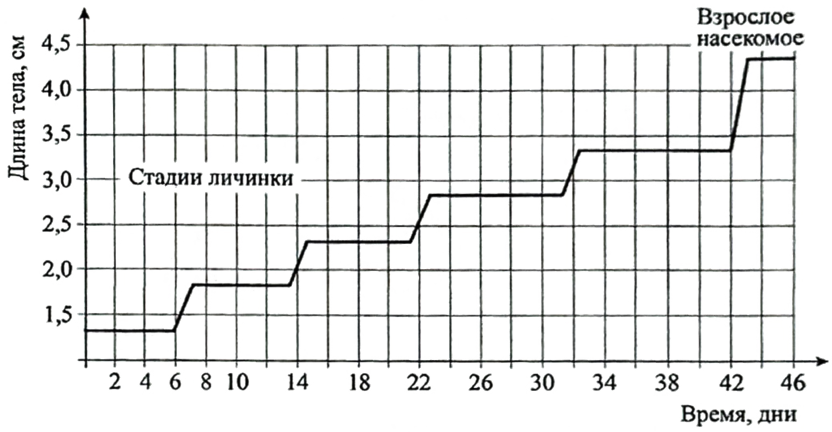 Проанализируйте график зависимости роста личинки насекомого во время линек от времени.