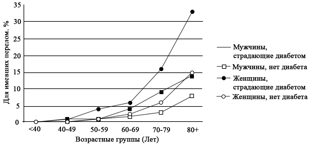 В исследовании собраны статистические данные по доле людей, имевших перелом шейки бедра, от общего числа людей соответствующей возрастной группы. Проанализируйте график, на котором отображена доля людей, имевших перелом шейки бедра.