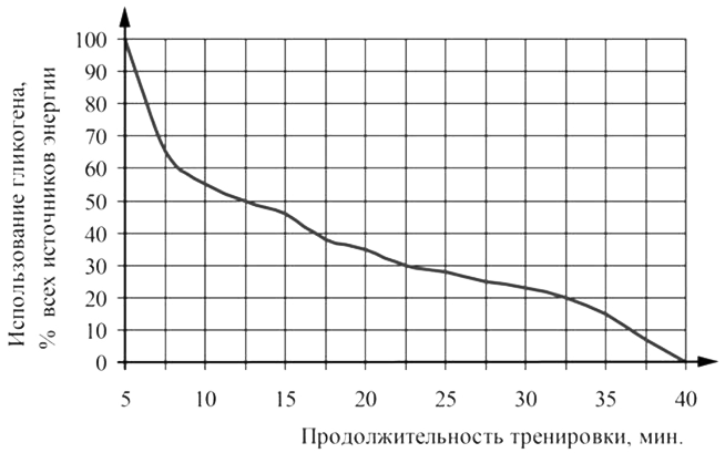 Проанализируйте график зависимости использования организмом человека энергии гликогена от продолжительности тренировки.