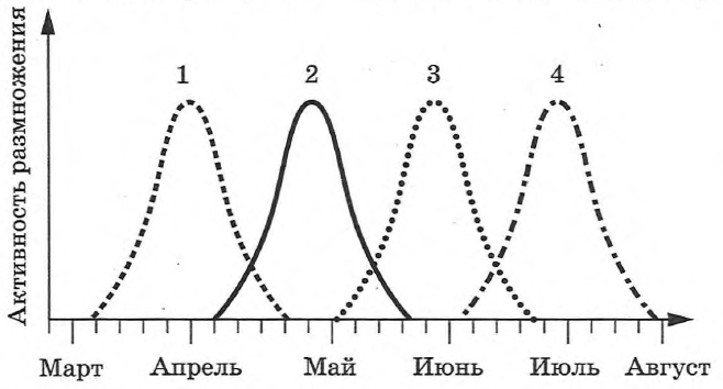 - Максимальная активность размножения у амфибий разных видов (1−4) одинакова.