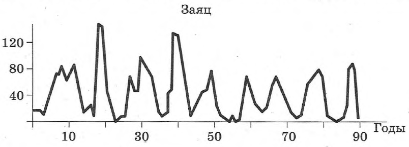 - Резкое возрастание численности зайцев сменяется резким падением численности.