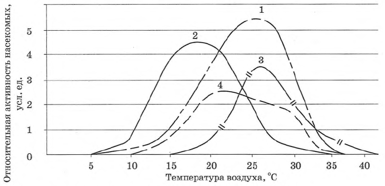Проанализируйте графики зависимости активности полета четырех видов слепней от температуры воздуха.