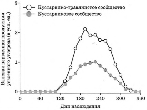 Проанализируйте график изменения валовой первичной продукции двух экосистем в течение года. Видовой состав кустарников в исследуемых экосистемах одинаков.