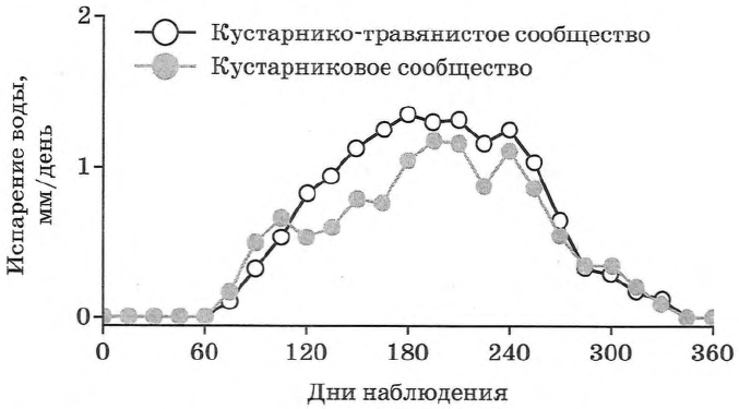 - Кустарниковое сообщество в целом испаряет меньше воды, чем кустарнико-травянистое.