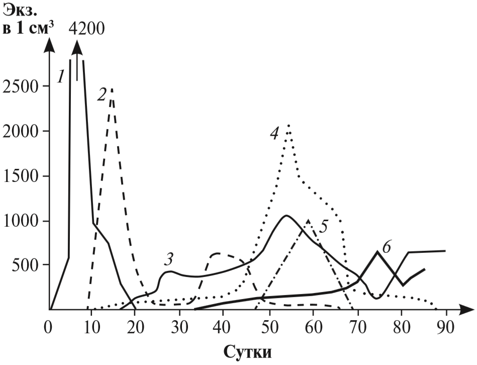 Проанализируйте график, отражающий смену простейших в сенном настое: 1 — жгутиковые; 2 — инфузории кольноды; 3 — парамеции; 4 — брюхоресничные инфузории; 5 — амебы; 6 — сувойки.