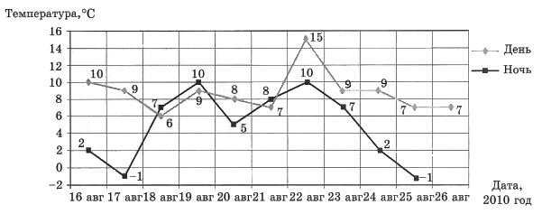 1) С 16 августа дневная температура начала резко расти. 2) Максимальная температура днем достигала +15°С. 3) Минимальная температура ночью не опускалась ниже отметки 0°С. 4) 25 августа температура снизилась на 8°С. 5) Ночные температуры были всегда плюсовые.