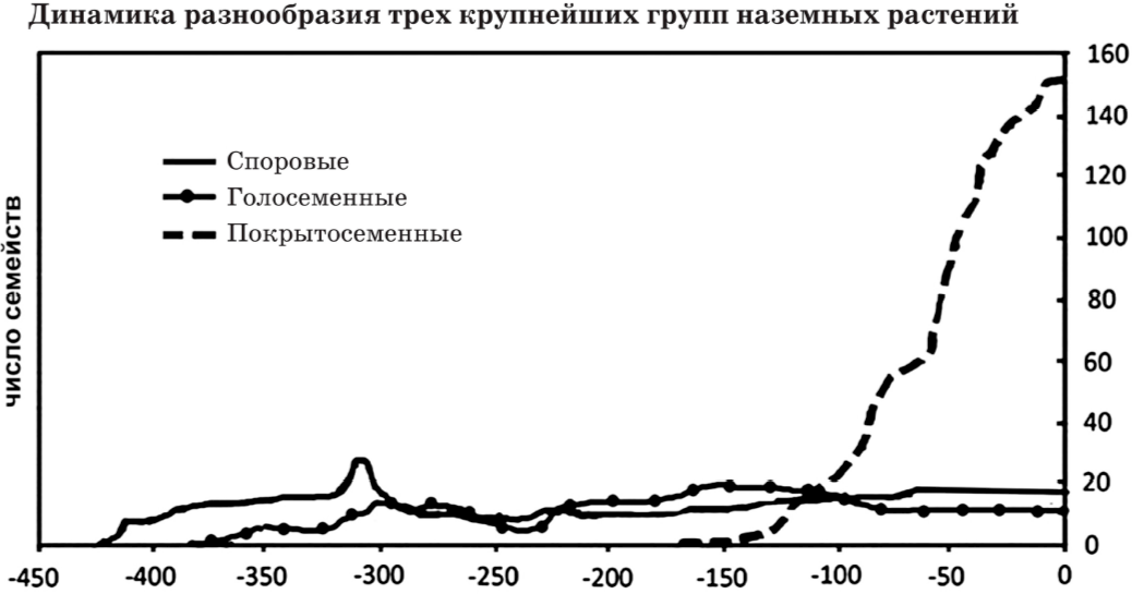 - После появления цветковых растений разнообразие споровых и голосеменных резко уменьшилось.