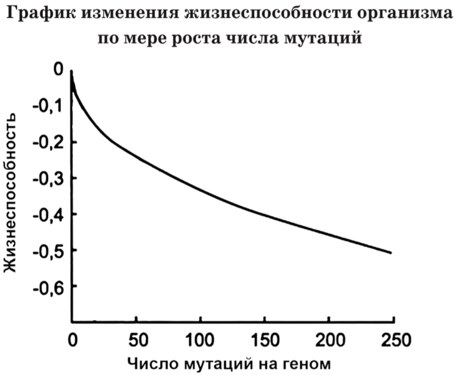 - После достижения определенного предела по количеству мутаций снижение жизнеспособности прекращается.