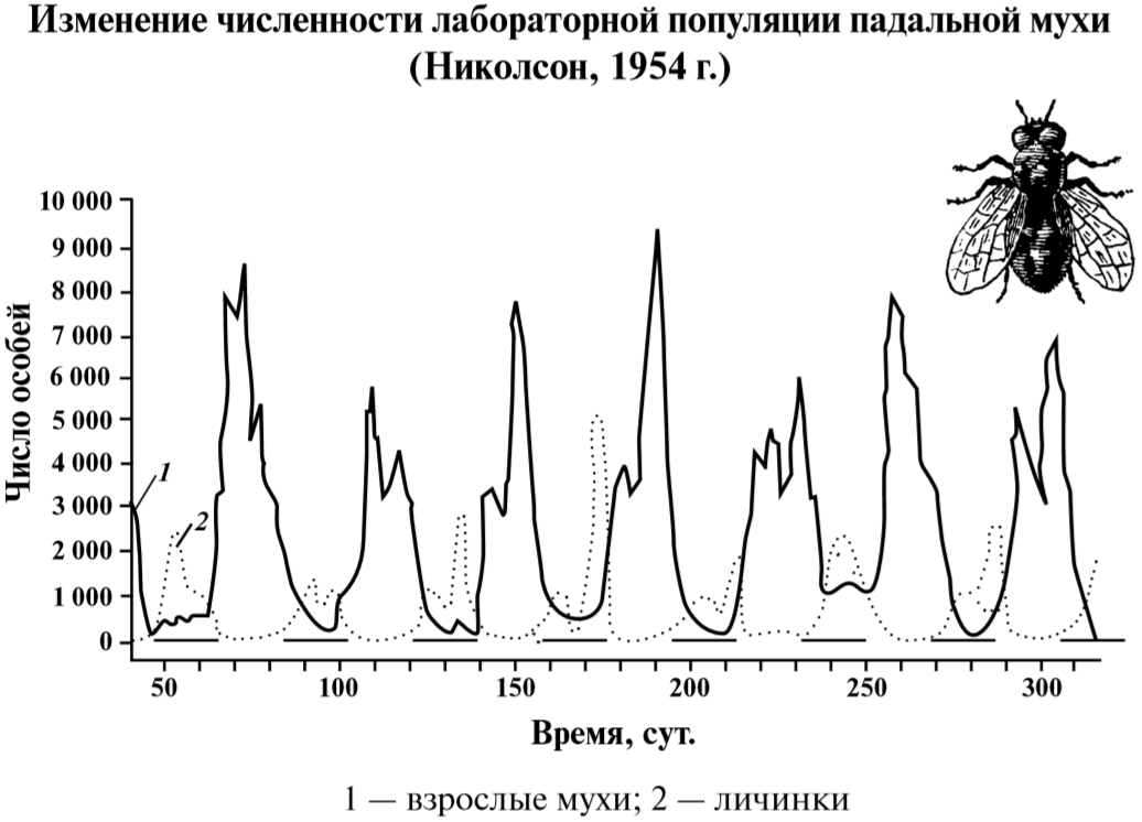 - В лабораторных условиях происходили циклические колебания численности популяции падальной мухи.