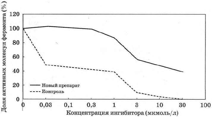 В исследовании изучалась эффективность ингибиторов фермента EGFR-киназы, ассоциированного с многими формами рака. Новый ингибитор сравнивали с препаратом, используемым в медицине (контроль). Проанализируйте график, на котором отображена эффективность ингибирования.