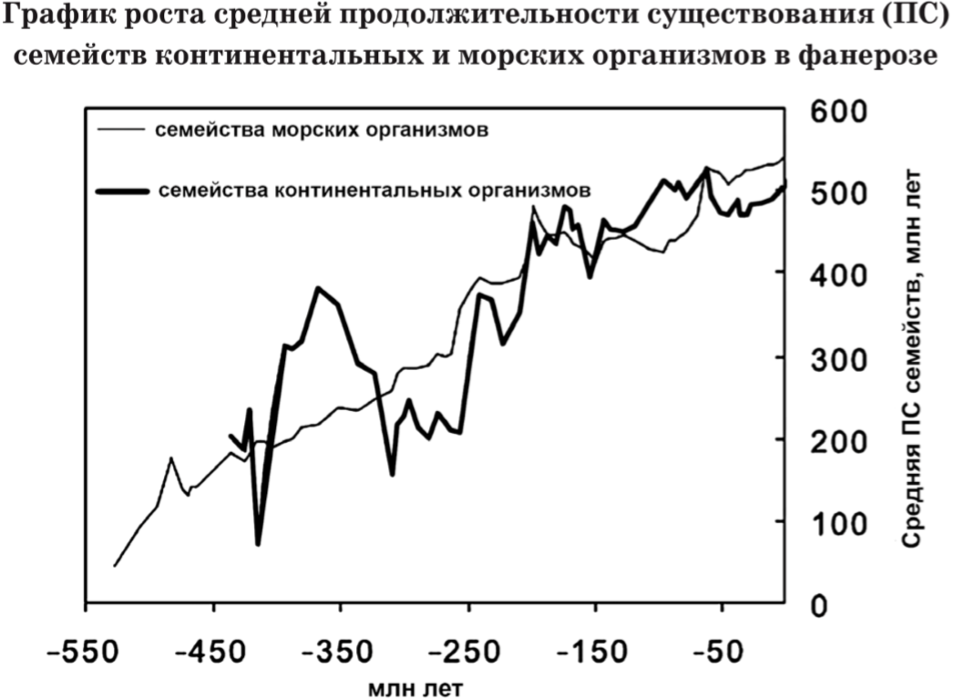 - Средняя продолжительность существования семейств морских организмов всегда выше, чем у континентальных организмов.