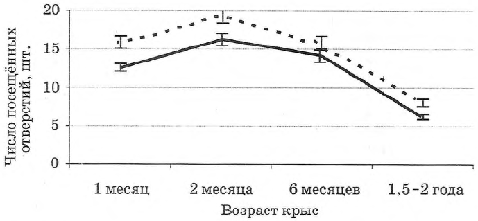 Проанализируйте график ориентировочного поведения крыс в эксперименте. Крысы помещались в клетку, на стенках которой располагались отверстия. Фиксировалось количество отверстий, которые посещали крысы. Сплошной линией обозначены показатели самцов крыс, пунктиром – самок.