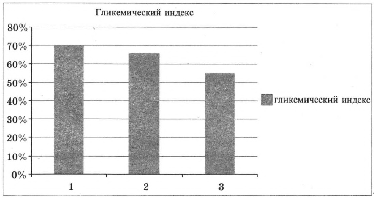 Помимо калорийности, каждый углеводосодержащий продукт, который человеческий организм в состоянии переварить, обладает еще и гликемическим индексом, средняя граница которого составляет 52-62%. Гликемический индекс — показатель влияния продуктов питания после их употребления на уровень глюкозы в крови. Проанализируйте диаграмму гликемического индекса.