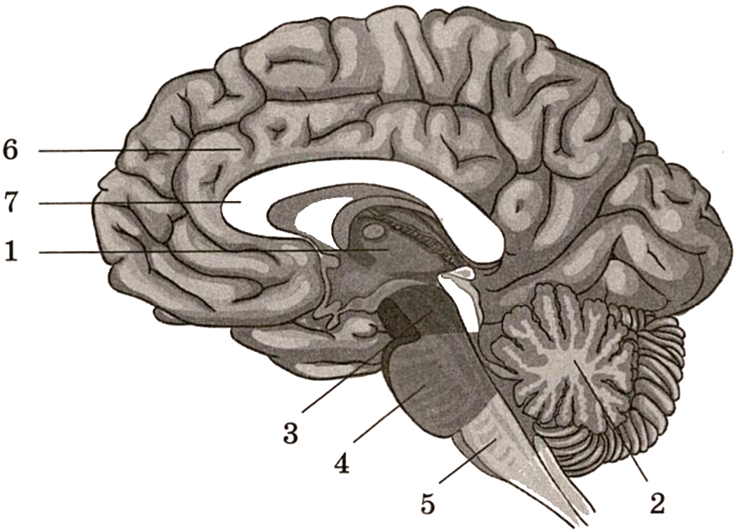 Какой цифрой на рисунке обозначен отдел мозга, который анатомически связан со спинным мозгом?
