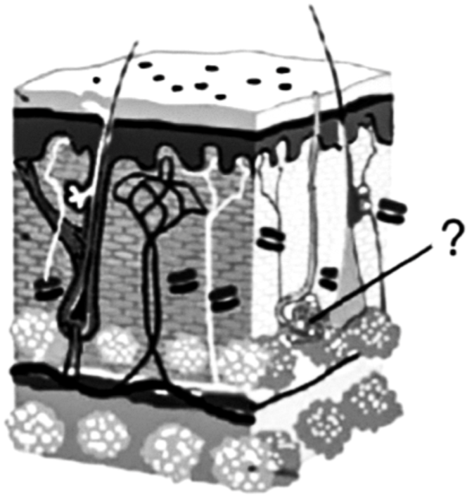 Рассмотрите рисунок с изображением фрагмента кожи человека. Определите название структуры, обозначенной знаком вопроса, ее местоположение и функцию. Заполните пустые ячейки таблицы, используя термины и процессы, приведенные в списке. Для каждой ячейки, обозначенной буквой, выберите соответствующий термин или процесс из предложенного списка.