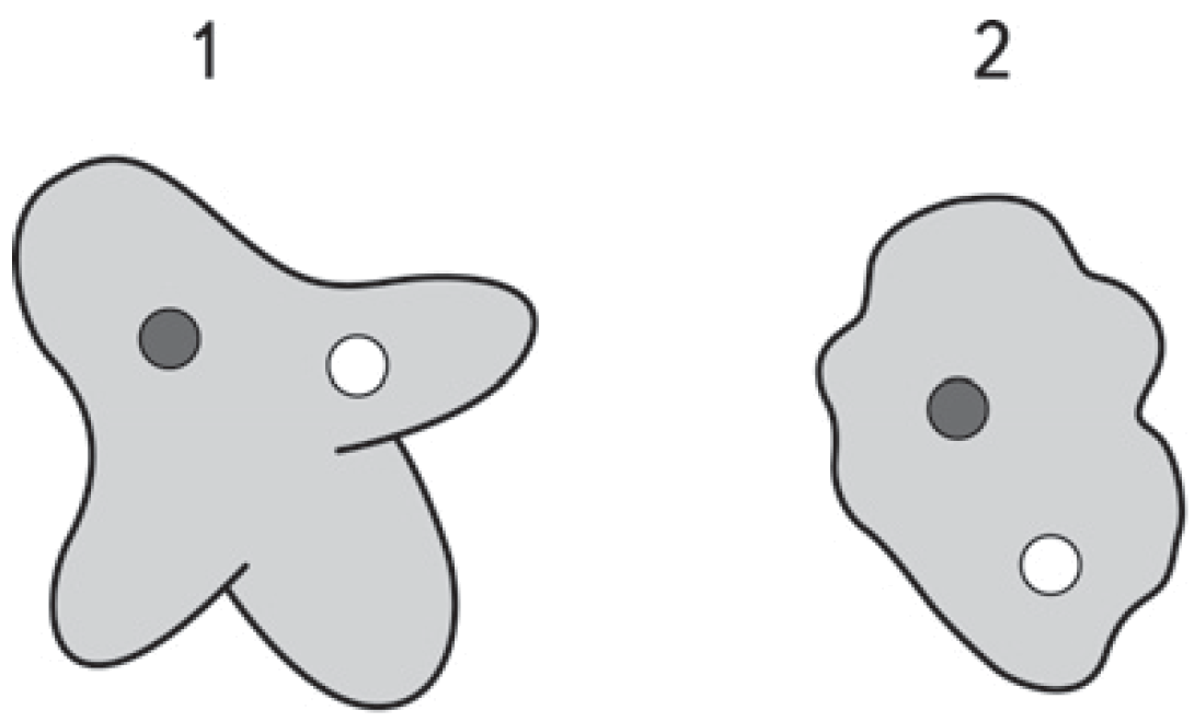 В ходе эксперимента учёных изучал под микроскопом воздействие поваренной соли на форму живых амёб. В начале эксперимента он поместил амёб в каплю воды (не дистиллированную), затем добавил в неё кристаллик поваренной соли, который растворился. Расположение амёб в капле воды не изменилось. Формы клетки одной из изучаемых амёб в начале и в конце эксперимента изображены на рисунках 1, 2.
