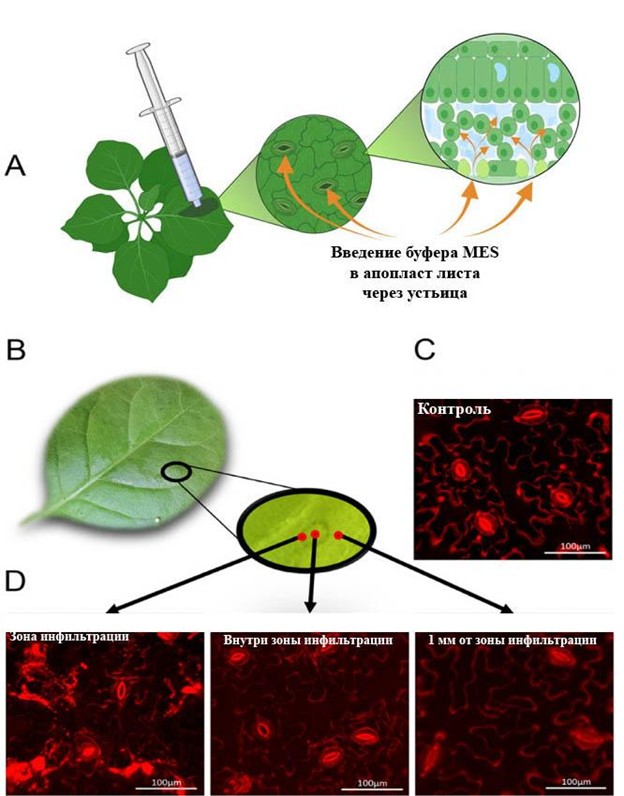 - Необходим для сравнения нетронутых жизнеспособных клеток с клетками после агроинфильтрации (на контрольном препарате видны флуоресцирующие устьица и чёткие границы клеток эпидермы). Если не поставить отрицательный контроль, непонятно будет, насколько агроинфильтрация повлияла на жизнеспособность клеток листа.