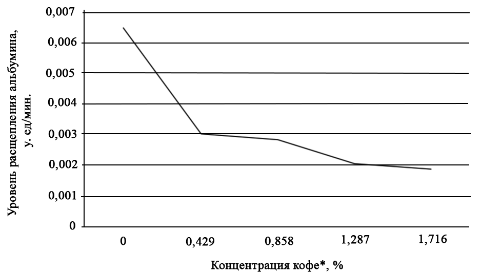 Экспериментатор изучал влияние кофе на работу фермента. Для этого в пробирки со смесью яичного белка альбумина он добавлял фермент протеазу (бромелаин), а затем кофе в различной концентрации. Через 15 мин. инкубации пробирки при 37°С исследователь фиксировал результат. Результаты приведены на графике.