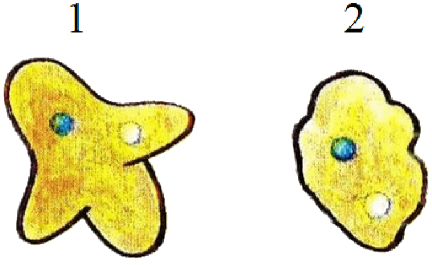 Ученый проводил эксперимент с амебами. В эксперименте он изучал под микроскопом живых амеб. В начале эксперимента амебы были в водной (не дистиллированной) среде, затем в воду был помещен кристаллик поваренной соли, который растворился. Расположение амеб в капле воды не изменилось. Формы клетки одной из изучаемых амеб в начале и в конце эксперимента изображены на рисунках 1, 2.